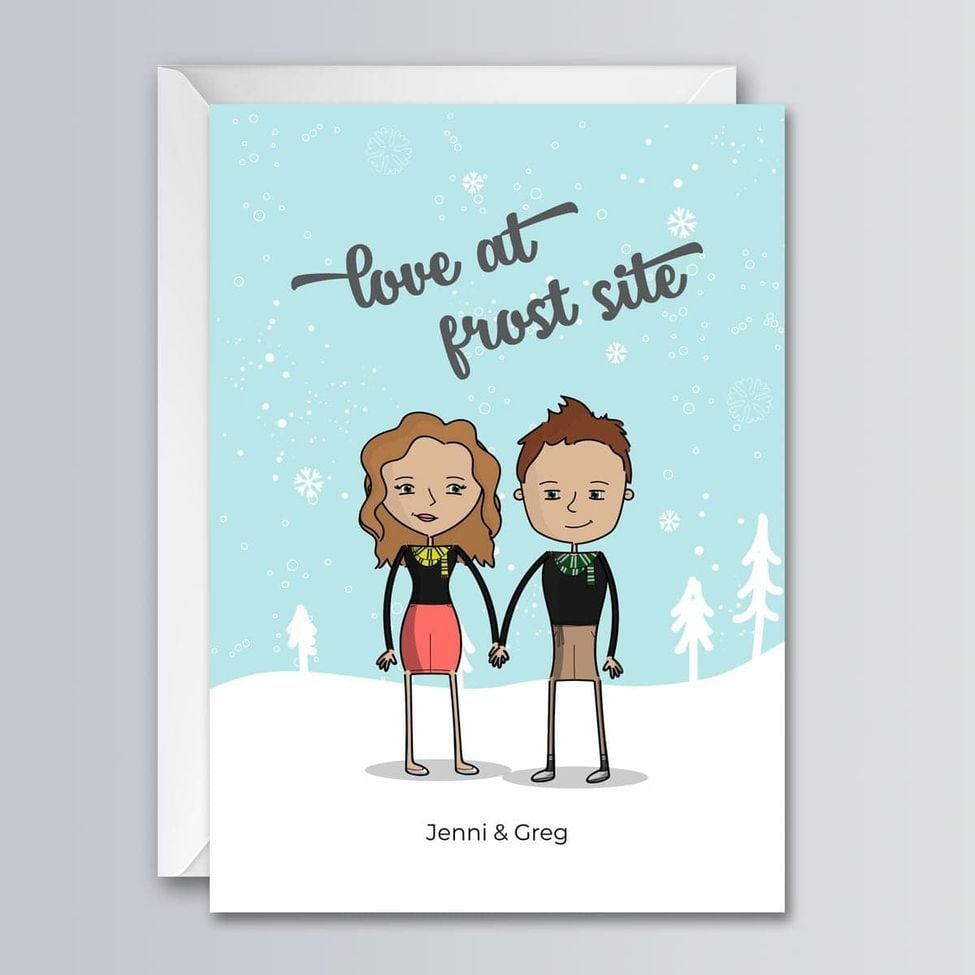Skip the generic greeting cards and create your very own customizable card! This romantic card features Lovemojis of you and your loved one holding hands on a snowy day.