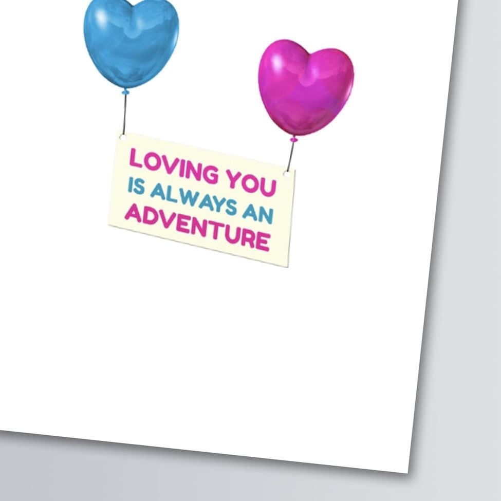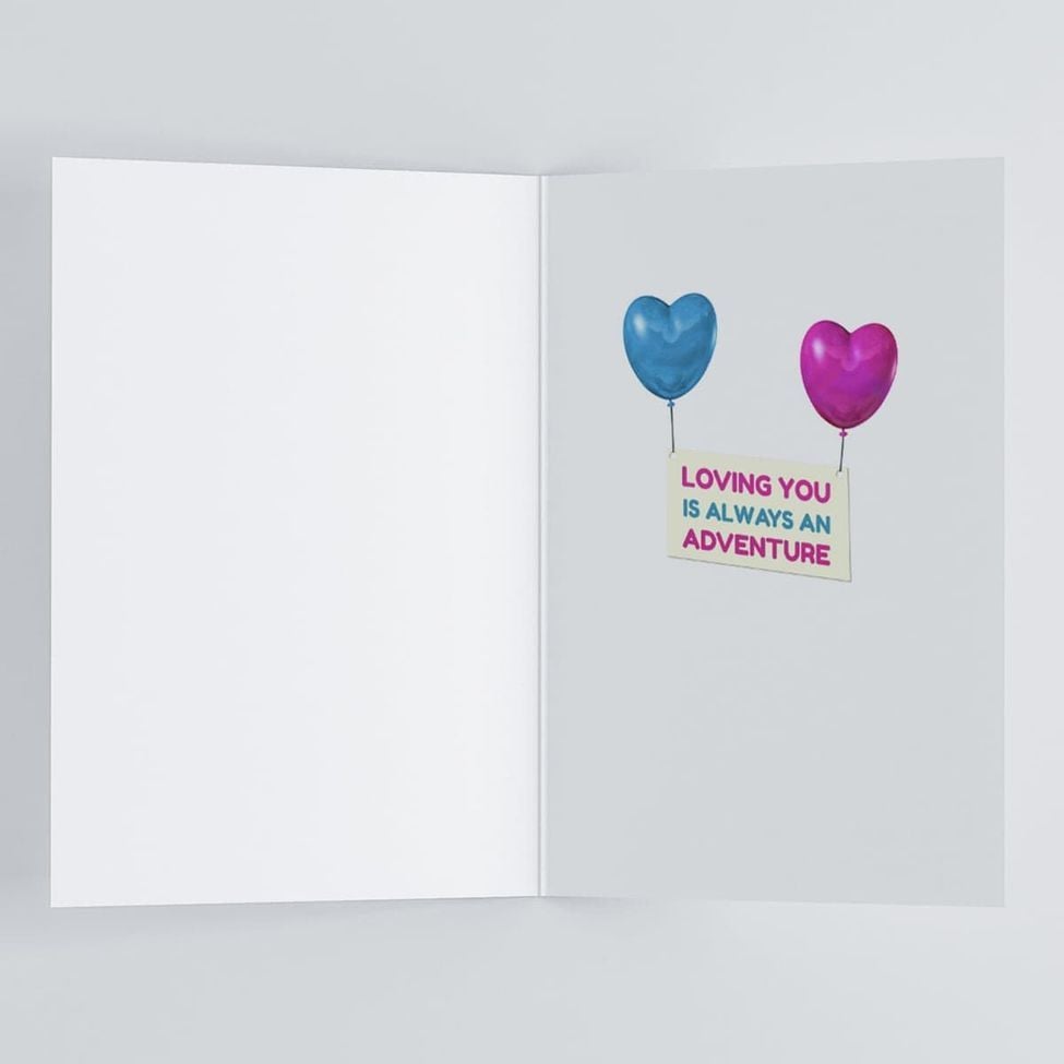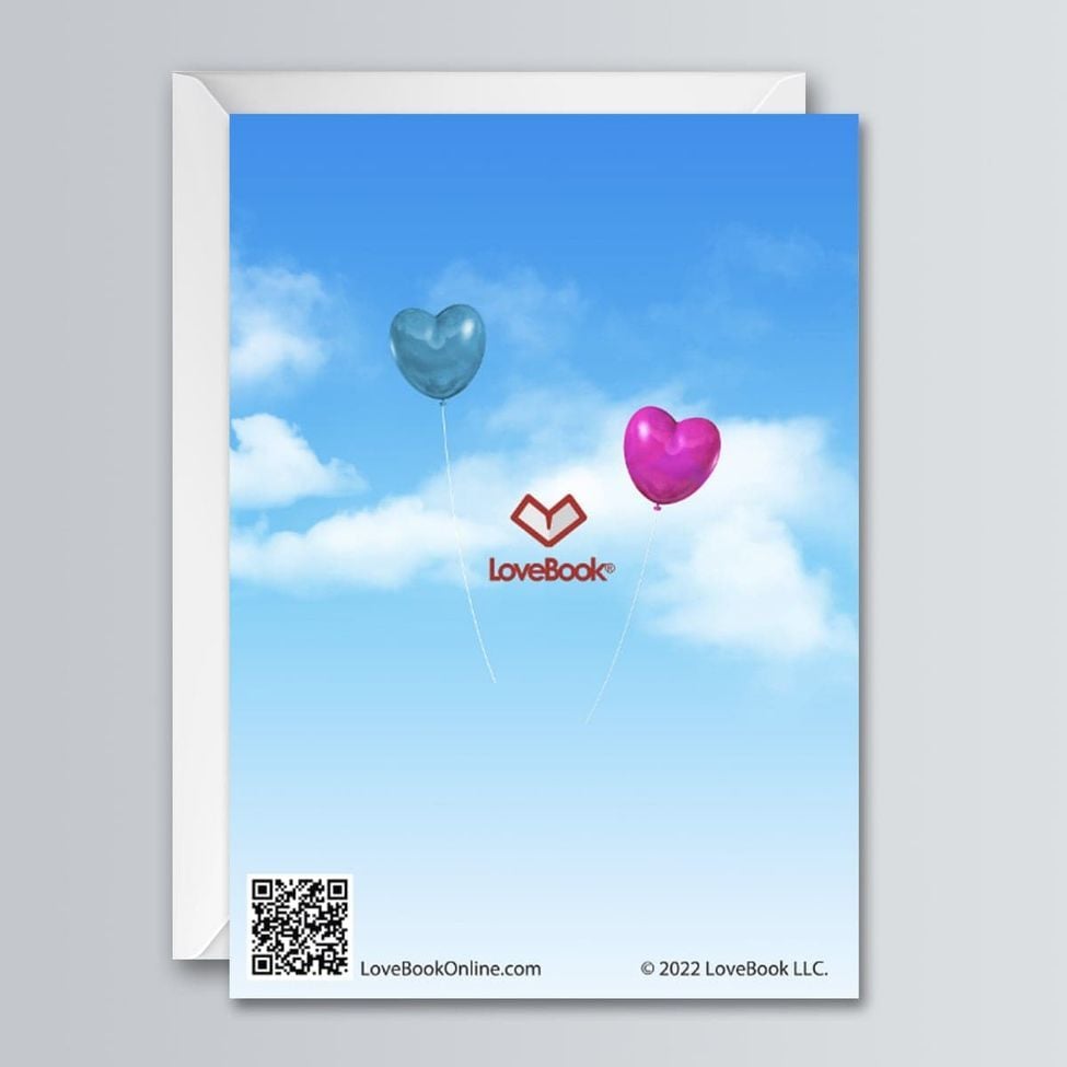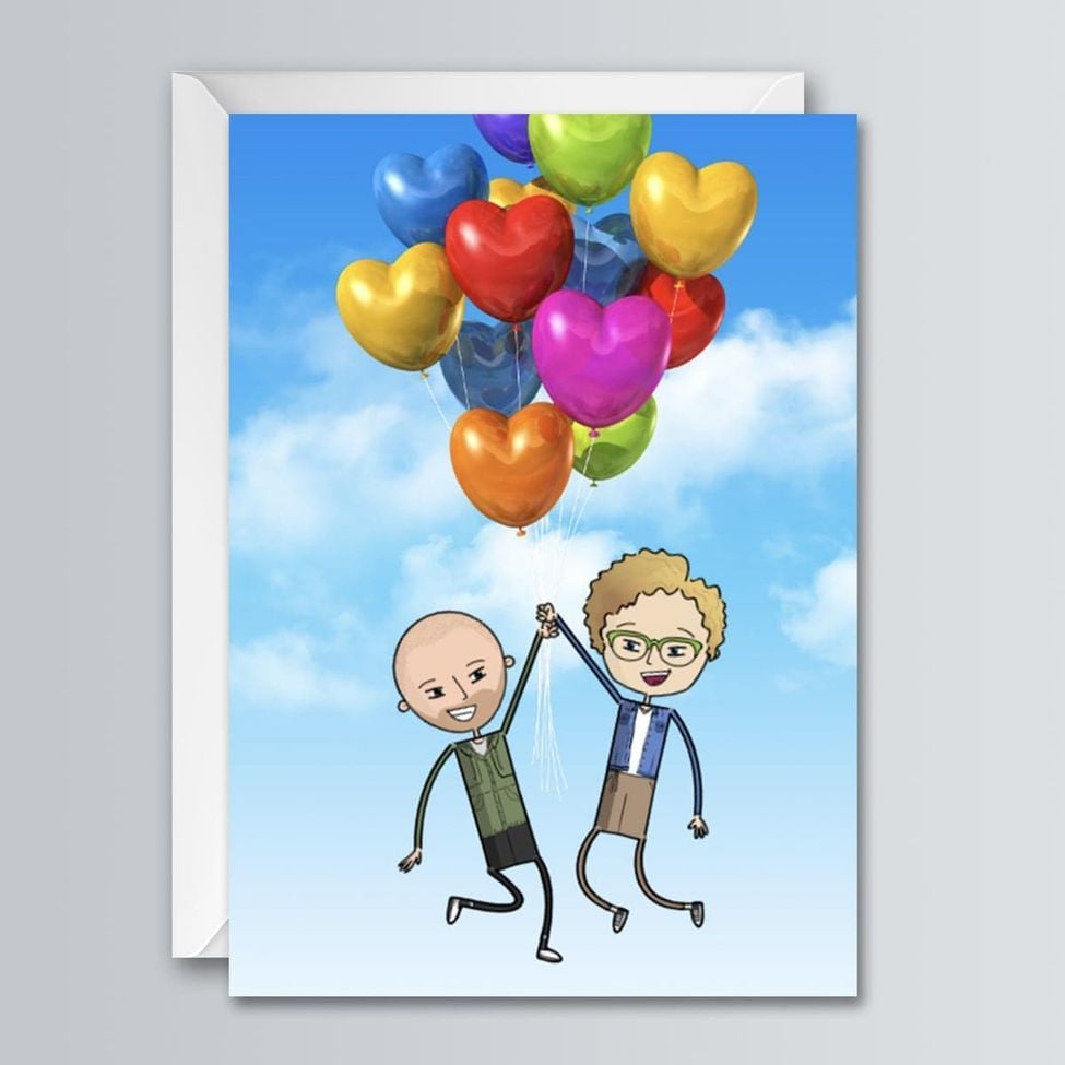 Skip the generic greeting cards and create your very own customizable card! This card features adorable Lovemojis of you and your partner floating from a bunch of balloons.