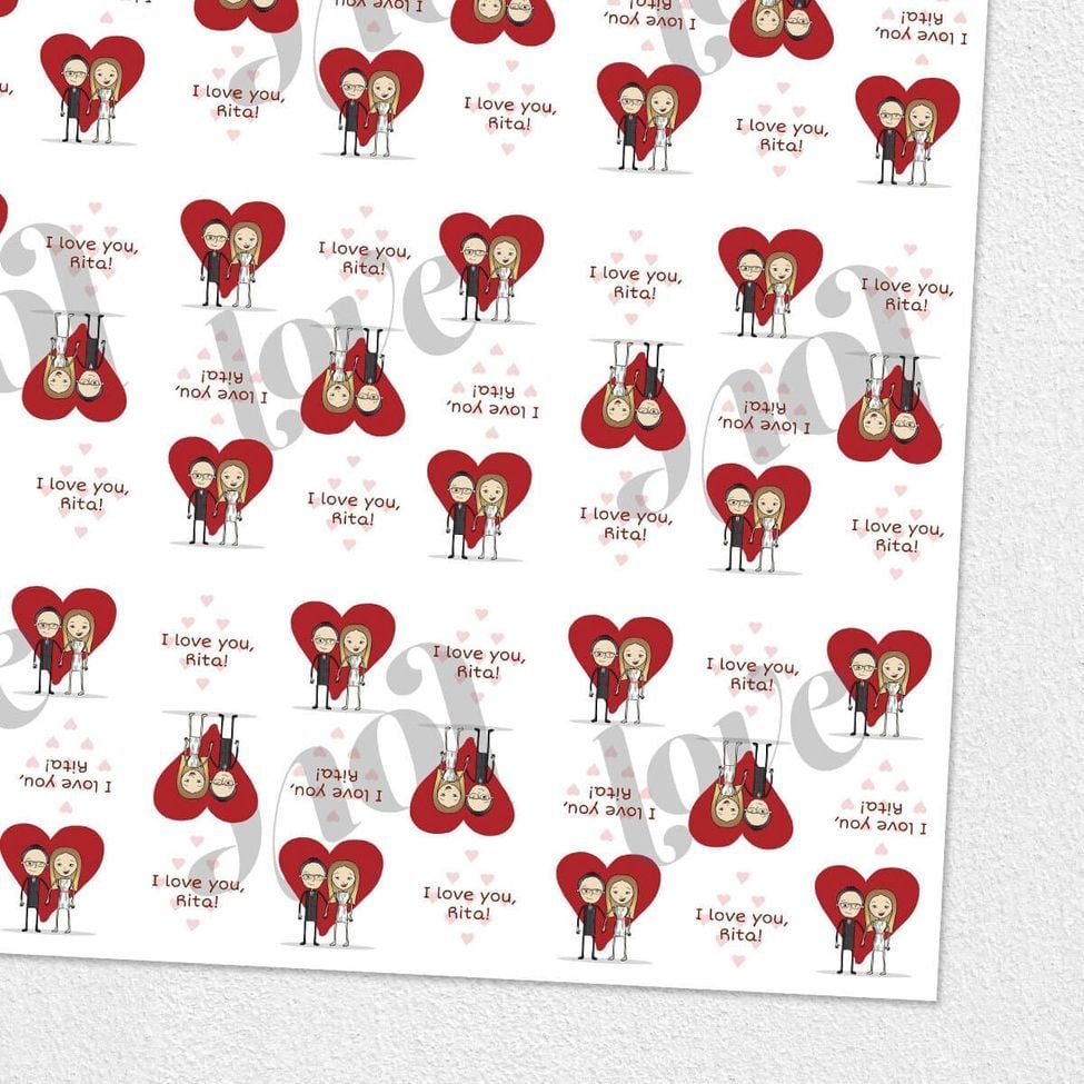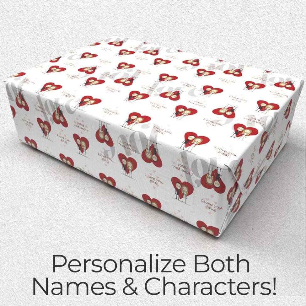 Wrap your favorite gifts with your favorite people! This adorable personalized gift wrapping features two Lovemoji characters in a custom love heart. Personalized character names are also printed on this gift wrap.