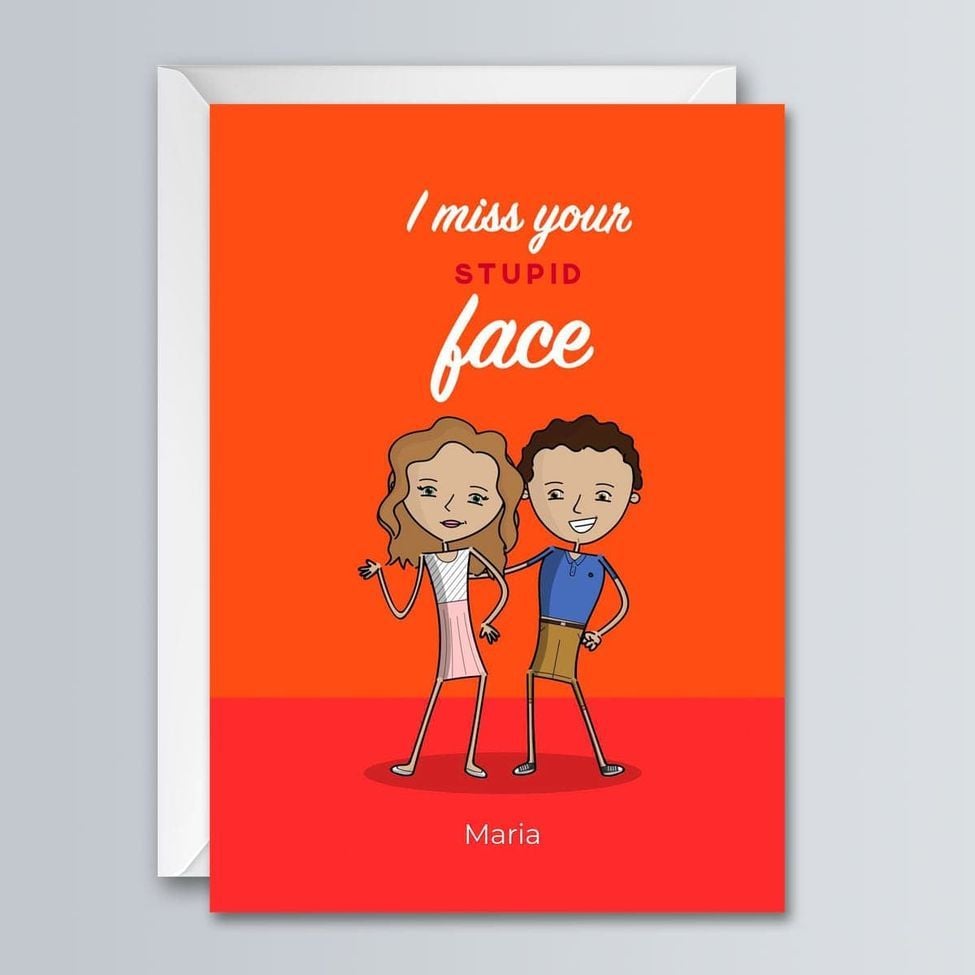 Skip the generic greeting cards and create your very own customizable card! This card features Lovemojis of you and your loved one making funny faces!