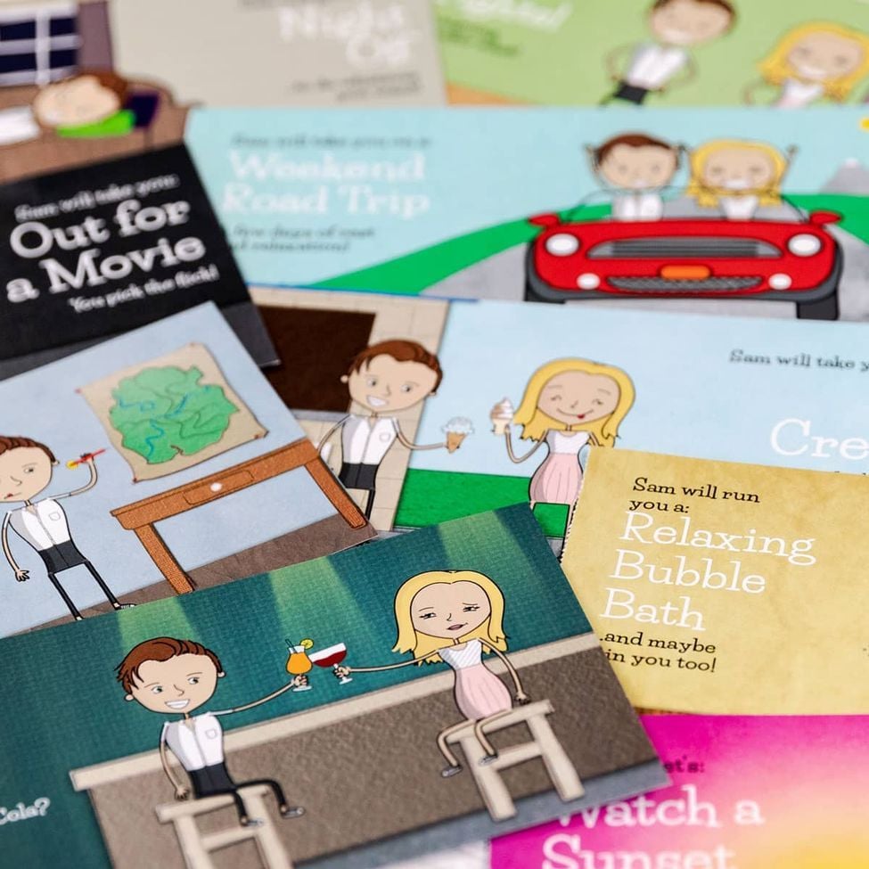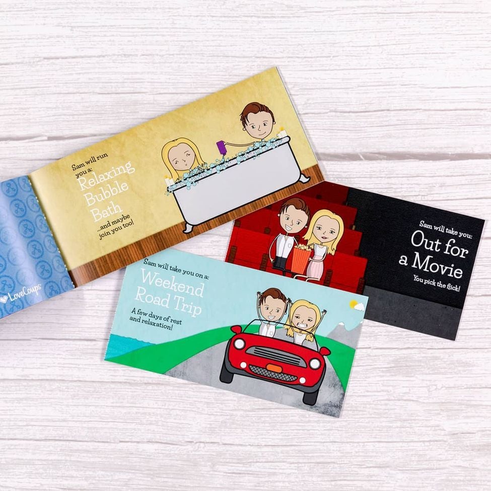 The Romantic Coupon Book provides a number of fun activities for you and your partner. This coupon book is personalized with your Lovemoji characters that look just like you and your significant other. Each page contains a different activity for you and your partner to enjoy.